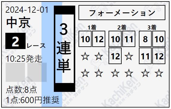 そして「中央研究所―的中部門―」に参加し、12月1日(日)に公開された買い目がこちらになります。