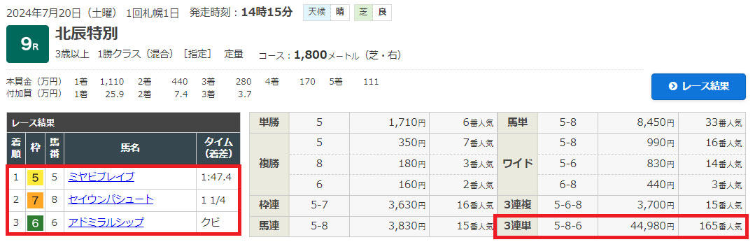1番人気の⑧が順当に勝利し、まさかの切ってしまった下位人気の⑥が3着に来てものの見事に不的中になってしまいました。