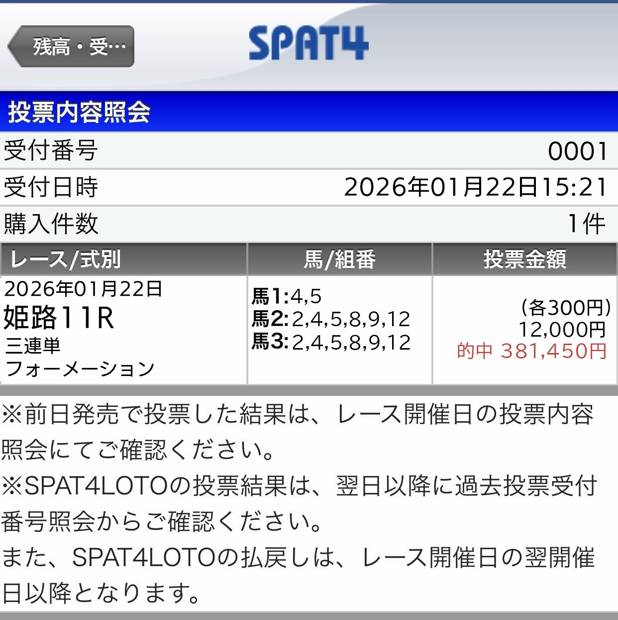 土日このサイトで稼がせてもらったから3連複の買い目にプラスして3連単も1点400円で購入してました。